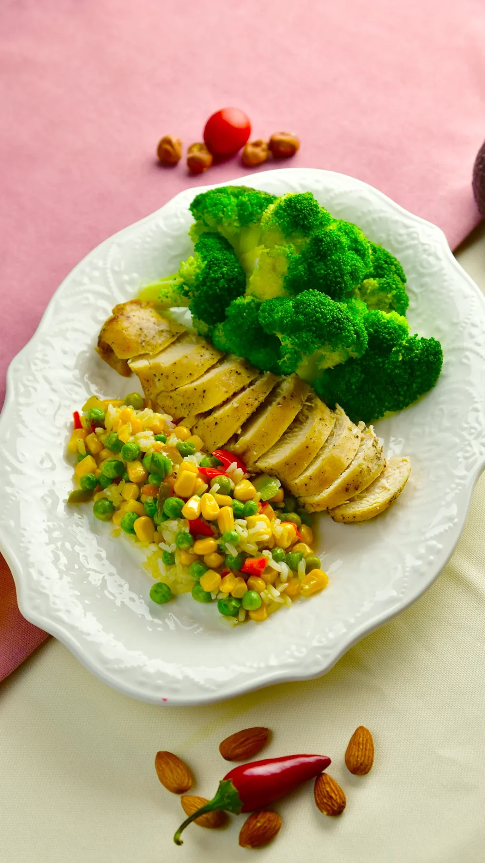Гавайская смесь с брокколи и куриной грудкой 3790 (Брокколи, гавайская смесь риса и овощей, запечённая куриная грудка, оливковое масло) 400 г / 362 ккал / Б 36.1 / Ж 14.8 / У 21.7