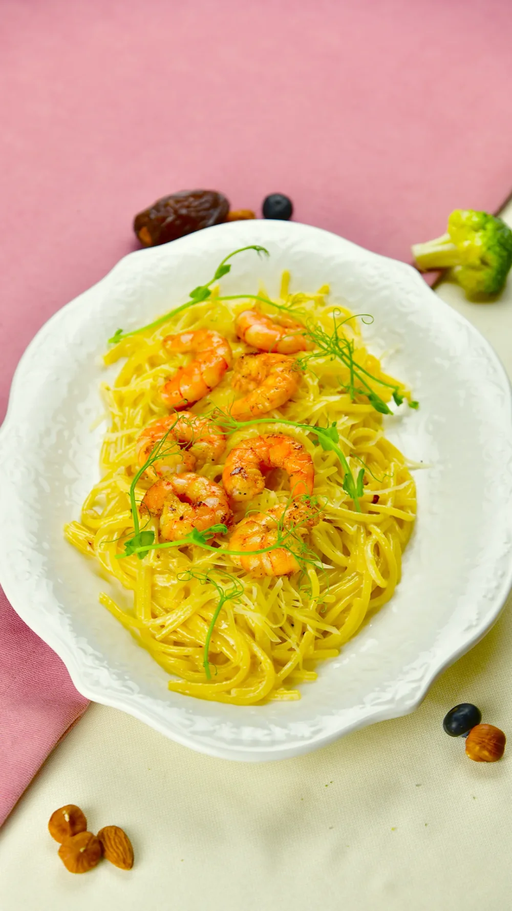 Gluten Free Spaghetti с тигровой креветкой 4190 (Спагетти из рисовой и кукурузной муки без глютена, сливочный соус, тигровые креветки, пармезан, микрозелень) 330 г / 478 ккал / Б 29.6 / Ж 21.4 / У 37.8