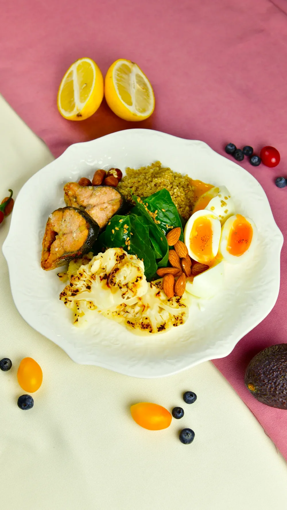 Healthy Bowl 1 3190 (Запечённая горбуша, цветная капуста, яйца пятиминутки, киноа, шпинат, орехи миндаль и фундук, семена льна) 400 г / 468 ккал / Б 42.7 / Ж 23.1 / У 25.8