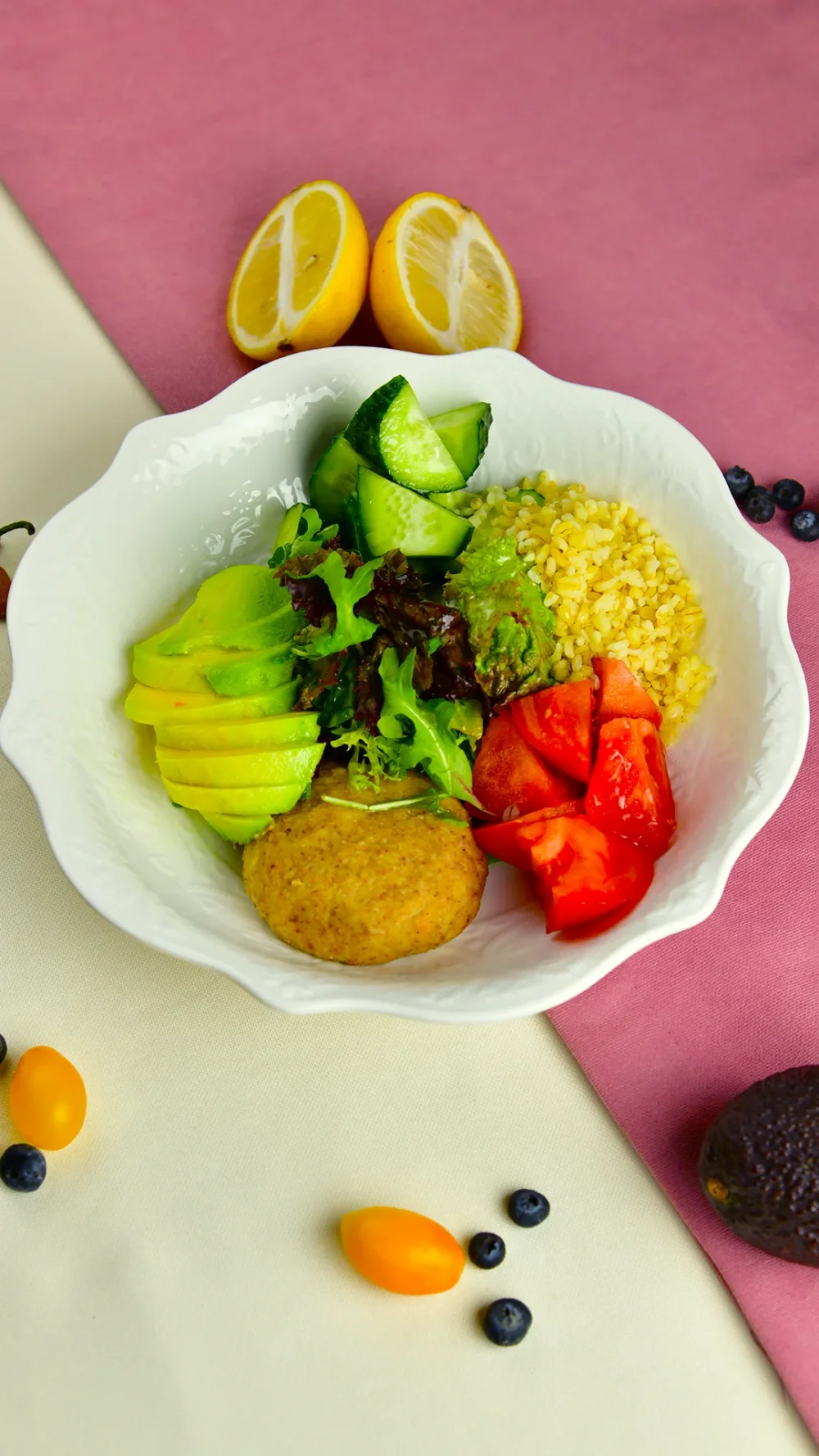 Healthy Bowl 3 3190 (Куриные котлеты на пару, булгур, авокадо, огурец, томат, микс салат, оливковое масло, семена льна) 400 г / 426 ккал / Б 38.7 / Ж 18.9 / У 24.6