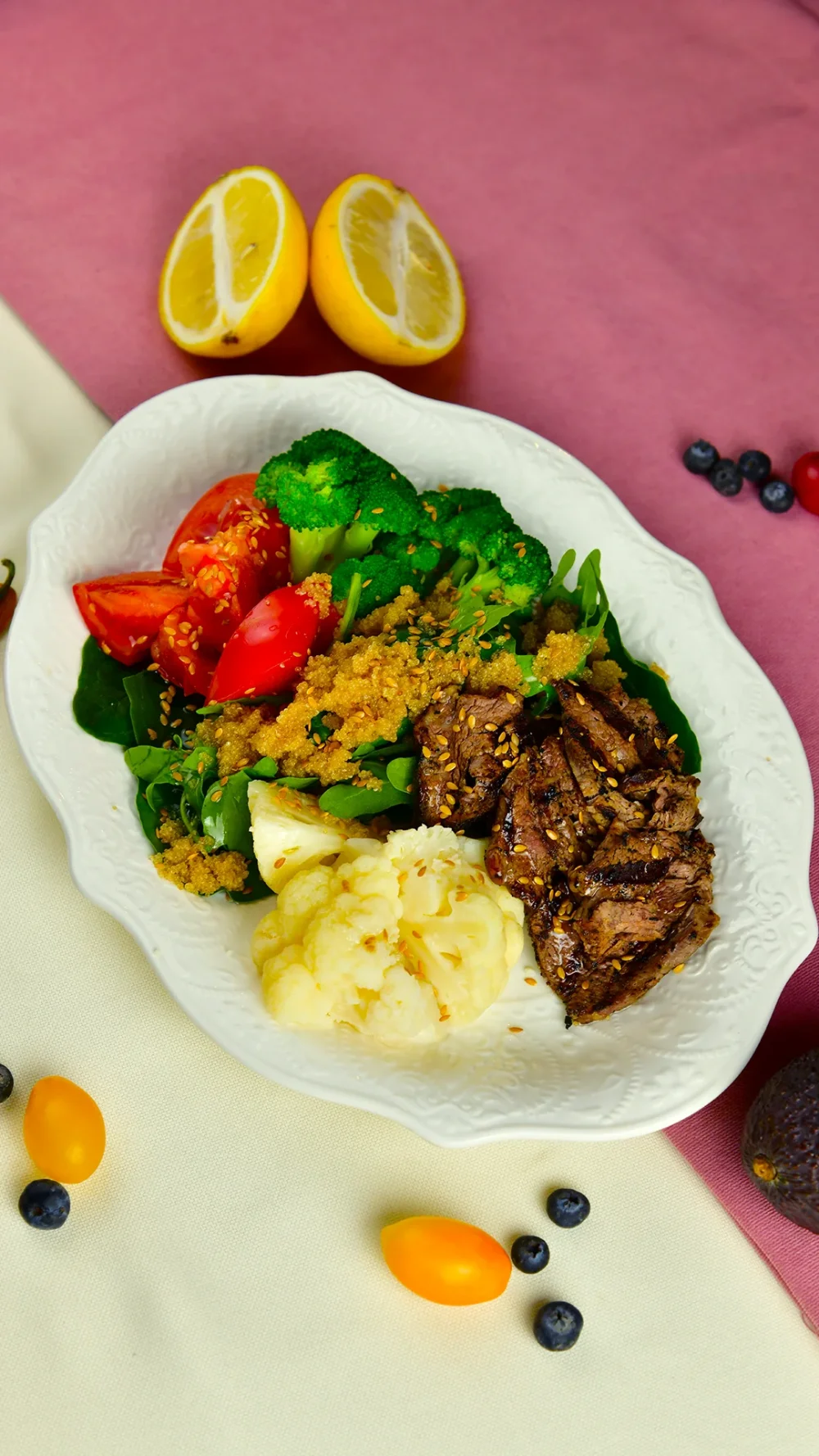 Healthy Bowl 4 3190 (Телятина на гриле, брокколи, цветная капуста, амарант, свежий шпинат, рукола, помидоры, оливковое масло, семена льна) 400 г / 454 ккал / Б 39.8 / Ж 19.2 / У 26.7
