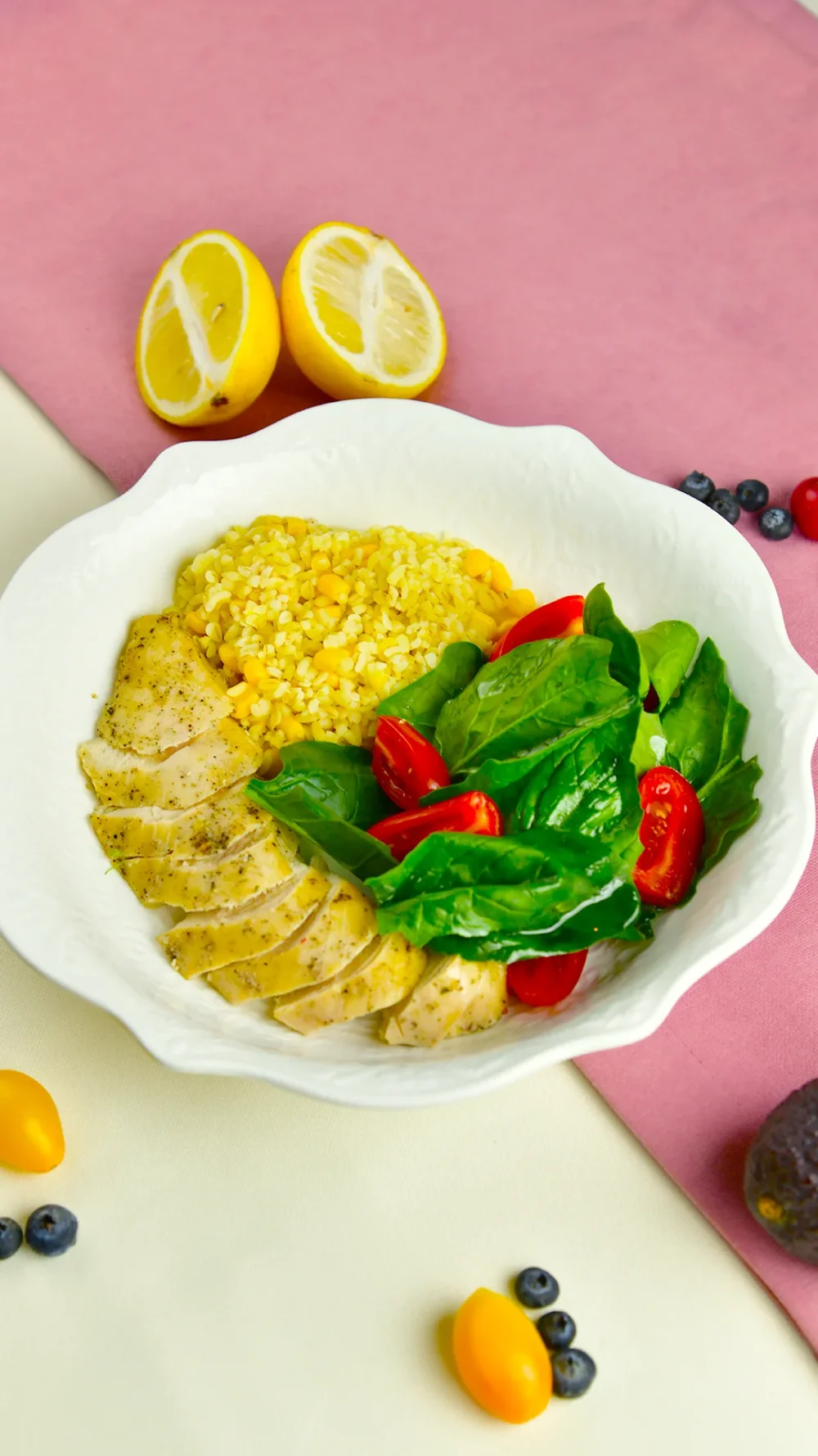 Куриная грудка со шпинатом и булгуром 3790 (Булгур, кукуруза, запечённая куриная грудка, свежий шпинат, черри, оливковое масло) 350 г / 378 ккал / Б 39.4 / Ж 12.6 / У 25.2
