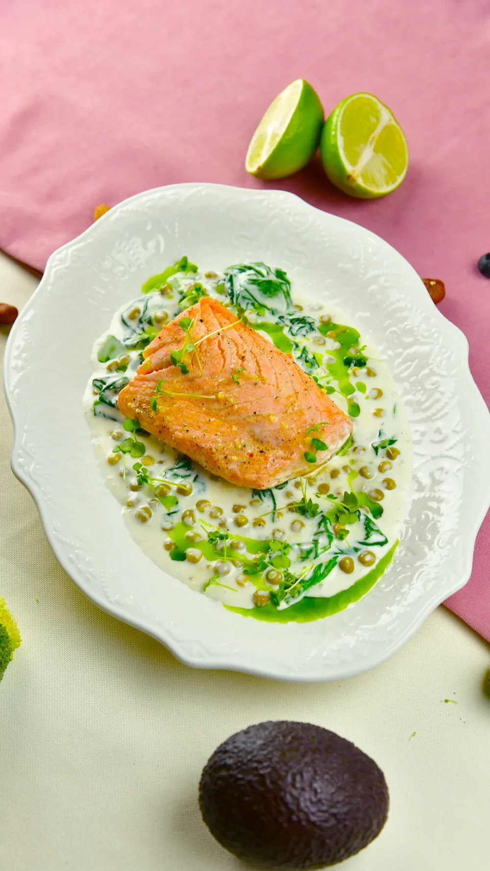 Лосось на пару с соусом из молодого горошка 6190 (Нежное филе лосося на пару, сливочный соус, шпинат, горошек, зелёное масло, микрозелень) 300 г / 412 ккал / Б 37.4 / Ж 25.6 / У 8.3
