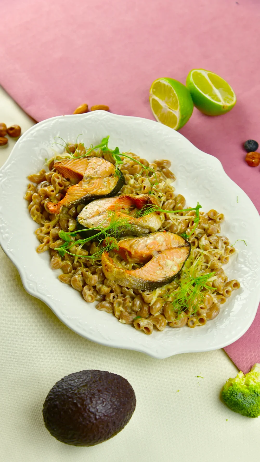 Maccheroni Gluten Free с горбушей 4190 (Рожки из гречневой и амарантовой муки без глютена, сливочный соус, запечённая горбуша, пармезан, микрозелень) 350 г / 486 ккал / Б 31.2 / Ж 22.8 / У 36.4