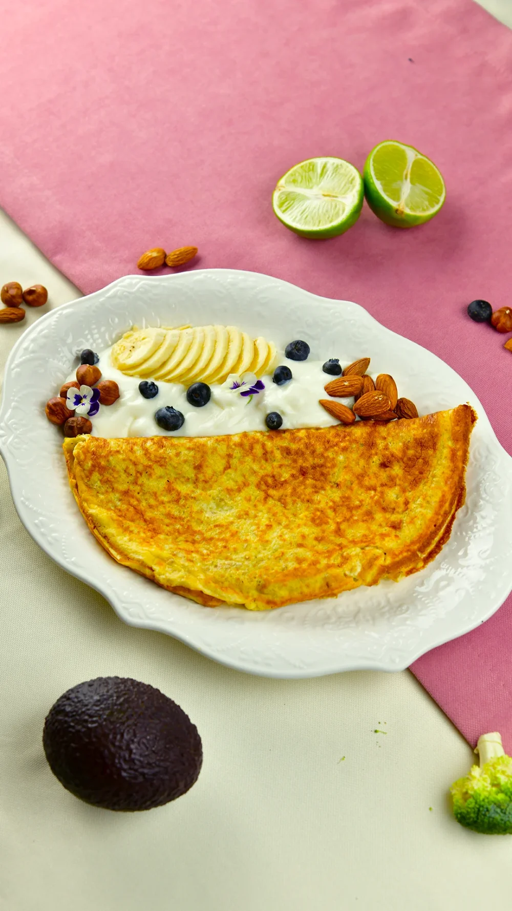 Овсяно-блин с греческим йогуртом и бананом 2190 (Овсяный блин, греческий йогурт, банан, фундук, миндаль, голубика) 330 г / 412 ккал / Б 23.8 / Ж 23.6 / У 26.4
