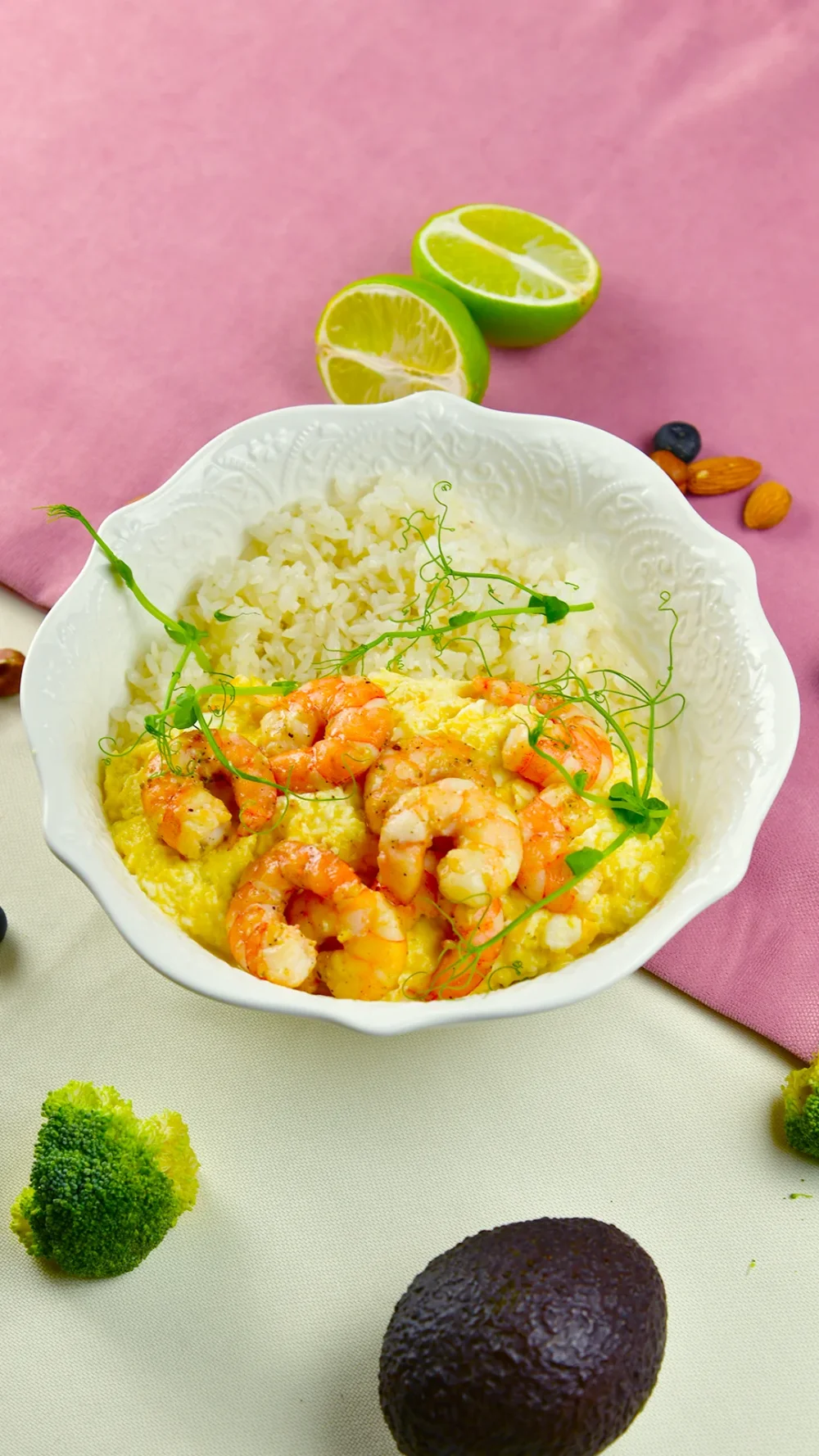 Припущенный рис со скремблом и креветками 3790 (Отварной рис, воздушный скрембл, тигровые креветки, лимон, микрозелень) 400 г / 548 ккал / Б 37.6 / Ж 26.4 / У 33.9