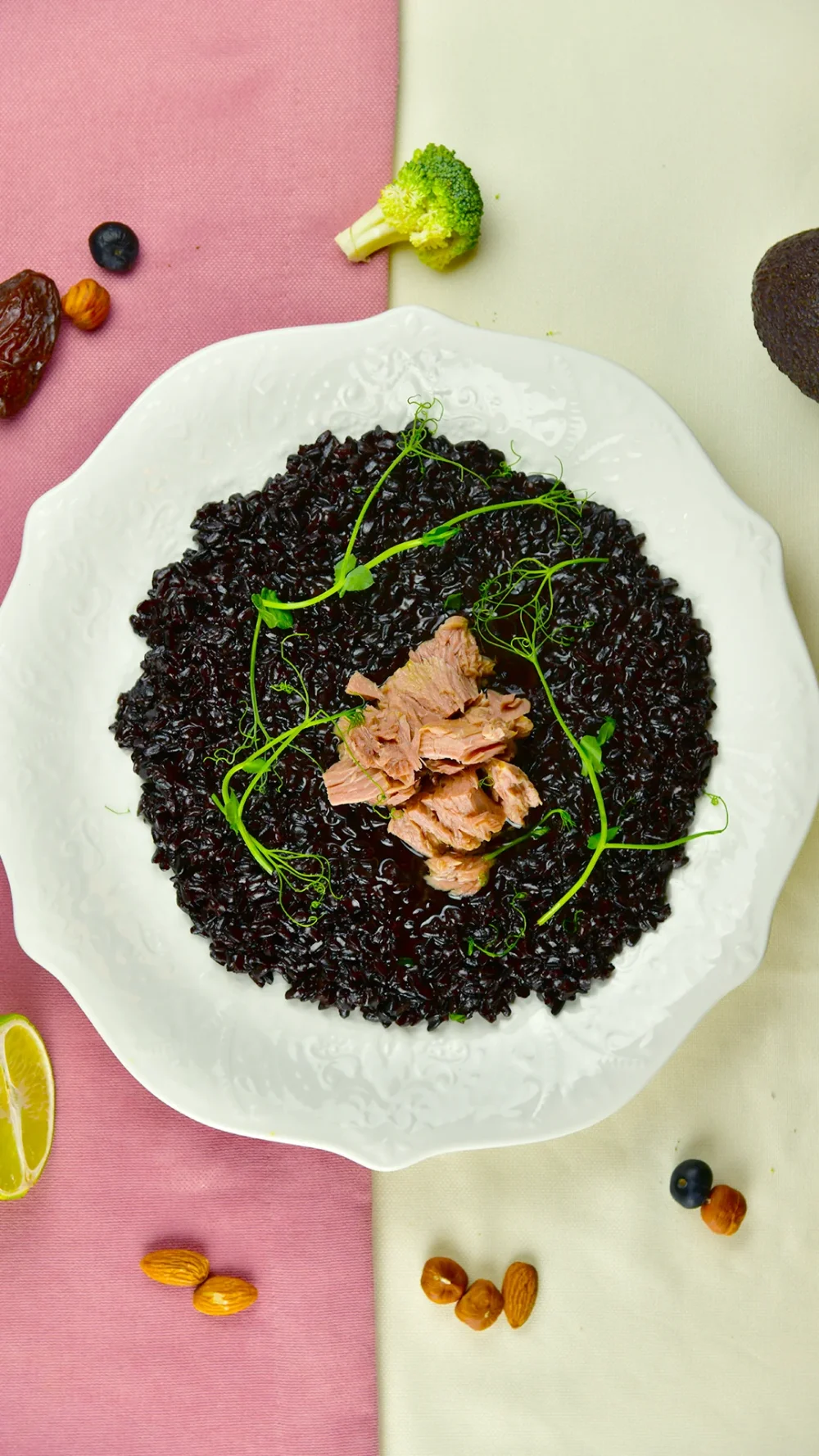 Ризотто из чёрного риса с кусочками тунца 3790 (Чёрный рис, пармезан, тунец, микрозелень) 350 г / 512 ккал / Б 32.4 / Ж 22.7 / У 43.8