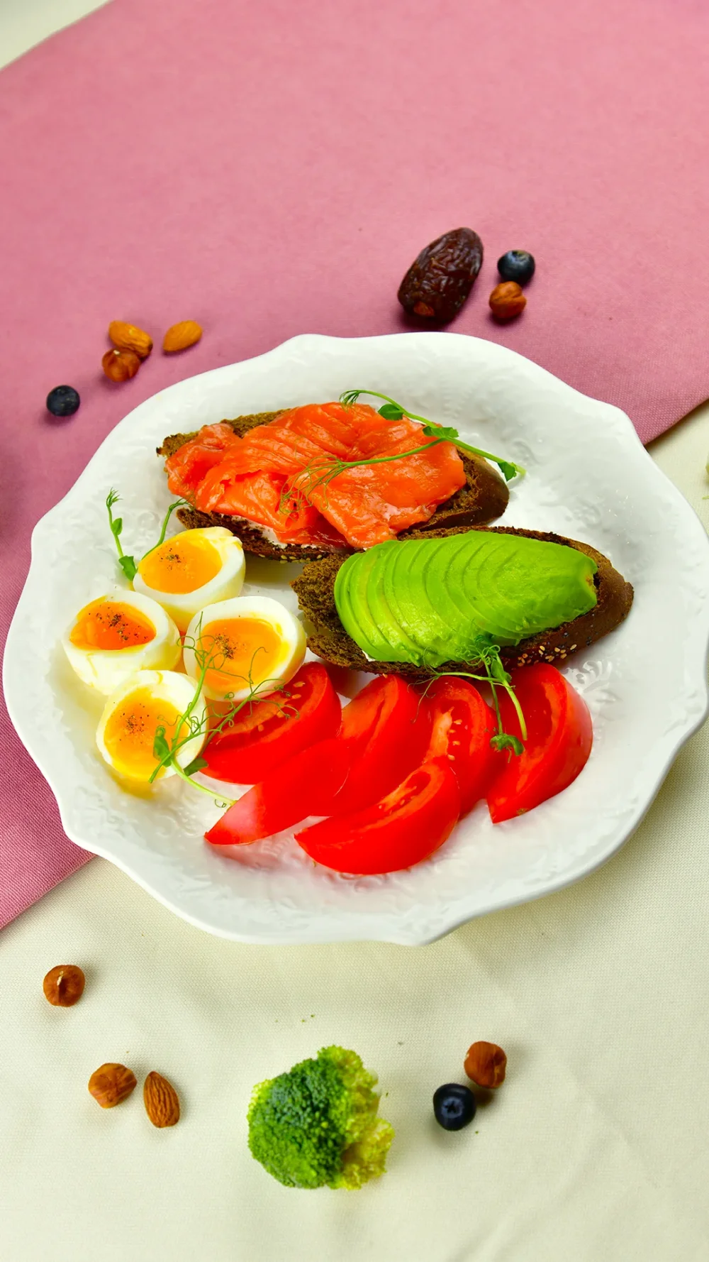 Ржаной хлеб с авокадо и малосольным лососем 3190 (Ржаной багет, творожный сыр, авокадо, малосольный лосось, яйца пятиминутки, помидоры, микрозелень) 310 г / 324 ккал / Б 21.4 / Ж 17.2 / У 22.8
