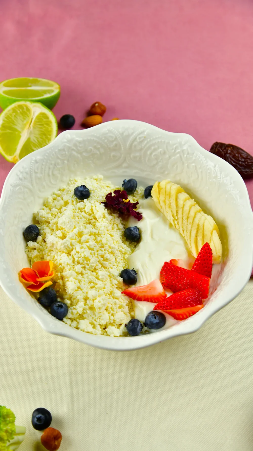 Творог с греческим йогуртом и ягодами 2890 (Творог 4%, сахарозаменитель, греческий йогурт 4.9%, черника, банан, клубника) 310 г / 228 ккал / Б 22.6 / Ж 7.5 / У 18.2